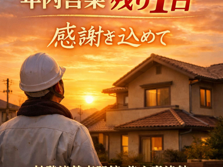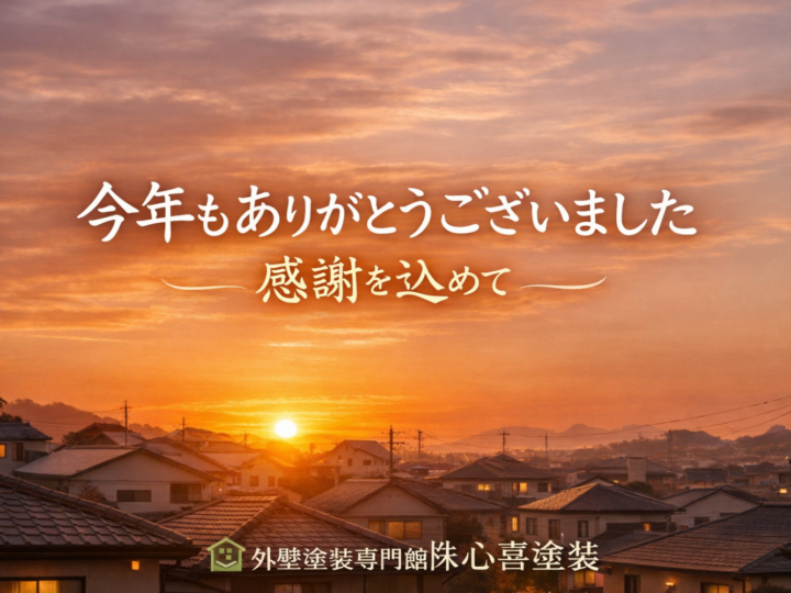 【年内最終日】今年もありがとうございました。 外壁塗装専門館 ㈱心喜塗装です。 本日をもちまして、今年の営業も無事に最終日を迎えることができました。 こうして一年を締めくくれるのも、皆さま一人ひとりとのご縁があってこそです。 今年も多くのお住まいに関わらせていただき、 外壁塗装・屋根塗装・防水工事を通して「住まいを守るお手伝い」ができたこと、 スタッフ一同、心より感謝しております。 振り返ると「当たり前ではない一年」 塗装工事は、決して安いお買い物ではありません。 その大切な工事を、数ある業者の中から私たちに任せていただいたこと。 そして、工事期間中のご理解・ご協力、近隣の皆さまの温かい対応。 どれもが“当たり前ではない”ことだと、改めて感じた一年でした。 「頼んでよかった」 「また何かあれば相談します」 そんなお言葉一つひとつが、私たちの原動力です。 年末年始は“住まいを気にかける時間”に 年末年始は、ご家族でゆっくり過ごされる方も多い時期。 ふと外壁や屋根を見上げたとき、 ・ヒビ割れが気になる ・色あせてきた気がする ・ベランダの床が傷んでいる そんな小さな「気づき」があれば、それは住まいからのサインかもしれません。 すぐに工事をする必要がなくても、 知っておくだけで住まいの寿命は変わります。 来年も「正直で、丁寧な塗装」を 私たちは来年も変わらず、 ・分かりやすい説明 ・必要な工事だけをご提案 ・見えない部分も手を抜かない施工 を大切に、北九州の皆さまの住まいと向き合っていきます。 最後に 今年一年、本当にありがとうございました。 皆さまにとって新しい年が、 安心と笑顔に包まれる一年となりますように。 来年もどうぞ、よろしくお願いいたします。 外壁・屋根・防水のご相談はいつでもお気軽に 北九州の外壁塗装専門店として、 「相談してよかった」と思っていただける対応をお約束します。 外壁塗装専門館 株式会社 心喜塗装 住所 福岡県北九州市八幡西区則松4-20-7 ☎ 0120-556-463 OPEN 10時 ~ CLOSE 17時 までですので、お問合せいただきましたら時間内にご返信させていただきます。 些細な疑問などもお答えしております。 是非ご利用くださいませ。 https://gaihekitosousenmonkan.com/contact/ https://lin.ee/bm55wak お問い合わせはこちら ✎ 無料お見積依頼・お問い合わせ 無料屋根外壁診断 無料雨漏診断 施工事例 ☞ https://gaihekitosousenmonkan.com/works/ お客様の声 ☞ https://gaihekitosousenmonkan.com/voice/ ■ 年末年始休業期間 12月28日(日)~1月4日(日) 期間中は、現地調査・工事・お電話でのお問い合わせ対応をお休みいたします。 なお、ホームページのお問い合わせフォーム・メールは休業期間中も受付しておりますが、 ご返信は 1月5日(月)以降、順次対応 となりますのでご了承ください。 来年も、地域の皆さまに安心してお任せいただける外壁塗装・屋根塗装を目指し、丁寧な施工とわかりやすいご説明を心がけてまいります。 今後とも外壁塗装専門館をよろしくお願いいたします。