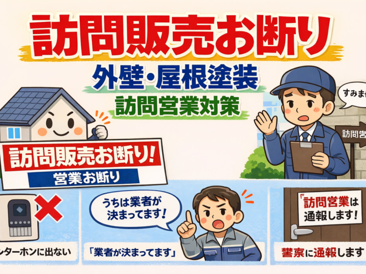 外壁・屋根塗装の訪問販売は防げる?少しの工夫で営業が来なくなるかもしれません 一戸建てに住んでいると、突然インターホンが鳴り「外壁や屋根の状態を無料で点検しています」といった訪問営業を受けた経験がある方も多いのではないでしょうか。 特に外壁塗装や屋根塗装の営業は、住宅街では比較的よく見られる訪問販売の一つです。 もちろんすべての業者が悪いわけではありませんが、訪問営業の中には強引な契約を迫ったり、不安をあおって契約を取ろうとするケースもあるため注意が必要です。 実は、ちょっとした工夫をするだけで訪問営業が来にくくなる可能性があります。 訪問販売お断りステッカーを貼る もっとも簡単で効果が期待できる方法が、玄関やインターホンの近くに「訪問販売お断り」や「営業お断り」のステッカーを貼ることです。 訪問営業の会社は、クレームやトラブルを避けたいと考えています。そのため、最初から営業を断っている家には訪問しないケースも多くあります。 実際、営業担当者の中には 「営業お断りの表示がある家には行かないように指示されている」 という会社もあります。 100円ショップやネット通販でも手軽に購入できるため、まずはこの方法から試してみるのがおすすめです。 インターホンに出ないのも有効な対策 訪問営業は基本的に「反応がある家」を優先します。 つまり、インターホンに出る家は営業できる可能性があると判断されやすいのです。 そのため ◎知らない相手には出ない ◎インターホン越しで対応する ◎必要がなければ無視する といった対応を続けると、「この家は営業が難しい」と判断され、訪問が減ることもあります。 最近は防犯カメラ付きインターホンなども普及しているので、相手を確認してから対応する習慣をつけるのも良いでしょう。 「業者が決まっています」と伝える もしインターホンに出てしまった場合は、無理に長く話を聞く必要はありません。 もっともシンプルで効果的なのが 「うちは業者が決まっています」と伝えることです。 外壁塗装や屋根工事の営業は、見込みがある家を優先して回っています。そのため、すでに付き合いのある業者がいる家だと分かると、無理に営業を続けるケースは少なくなります。 例えば以下のように伝えるだけでも十分です。 ◎「いつもお願いしている会社があります」 ◎「親戚が建築関係なのでそちらに頼んでいます」 ◎「管理会社に任せています」 この一言で営業が終わることも多いです。 屋根を見たと言われても慌てない 外壁塗装や屋根塗装の訪問営業では、よくあるトークがあります。 例えば ◎「お宅の屋根が割れているのが見えました」 ◎「屋根の一部が浮いているように見えました」 といった言い方です。 突然このようなことを言われると、不安になってしまう方もいるかもしれません。しかし、実際には遠くから屋根の細かい状態まで確認することは難しいケースも多いです。 そのため ◎「点検は結構です」 ◎「勝手に屋根を見ないでください」 とはっきり断ることも大切です。 不安な場合は、訪問してきた業者ではなく、自分で信頼できる会社を探して点検を依頼する方が安心です。 外壁塗装は決して安い工事ではありません。 急いで契約する必要はないため、その場で決めず必ず複数の業者を比較することが大切です。 外壁塗装専門館では 無理な営業や、すぐに工事をおすすめすることはありません。 今のお住まいの状態を丁寧に確認し、 必要なメンテナンスだけをご提案いたします。 まずは点検だけでもお気軽にご相談ください。 📌 無料の外壁診断、お見積り無料 📌カラーシミュレーション無料(※契約後サービス) 📌塗料比較のご提案 を行っています。「そろそろ塗り替え時かな?」と思ったら、外壁塗装専門館では、無料点検・メンテナンス相談も随時受付中です。 外壁塗装を長持ちさせる秘訣は、「日々のちょっとしたお手入れ」です。 清掃・点検・相談の3ステップを心がけることで、美しい外観と家の耐久性を保つことができます。 外壁塗装の失敗は、ほとんどが「知識不足」や「業者選びのミス」から起こります。 大切な住まいを長持ちさせるためには、信頼できる職人に依頼し、工事内容をしっかり確認することが何よりも重要です。 外壁塗装を検討されている方は、ぜひ今回の失敗例を参考にして、後悔のない塗り替えを実現してください。 外壁塗装専門館では、無料相談・無料見積もりをいつでも承っております。 どうぞお気軽にご相談ください! 只今25周年祭開催中です。 ■ お問い合わせ・ご相談はこちらから外壁塗装専門館下記まで 📞0120-556-463 お電話やホームページの問い合わせフォームから、無料見積もり・現地調査のご依頼を受け付けております。 お住まいのお悩み、どんなことでもお気軽にご相談ください! LINEやホームページからのお問合せに関しましては、営業時間内にご連絡いたします。 外壁・屋根塗装に関