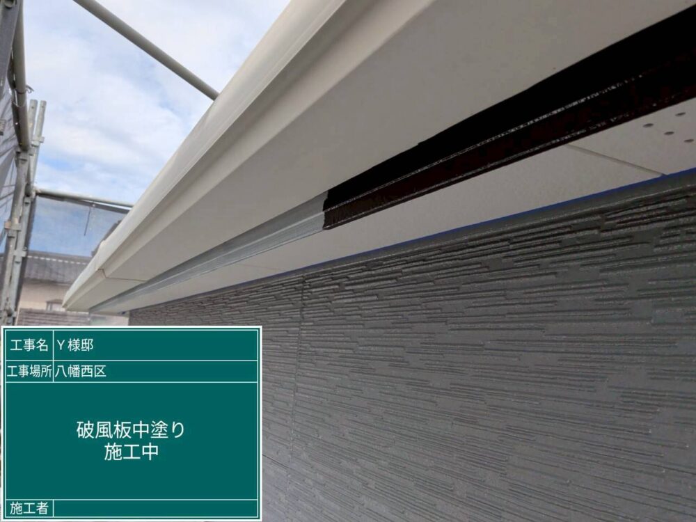 野外に設置されている破風や鼻隠しも紫外線や雨風によるダメージで、年月と共に劣化してしまうので、しっかり塗装いたします。破風板中塗り