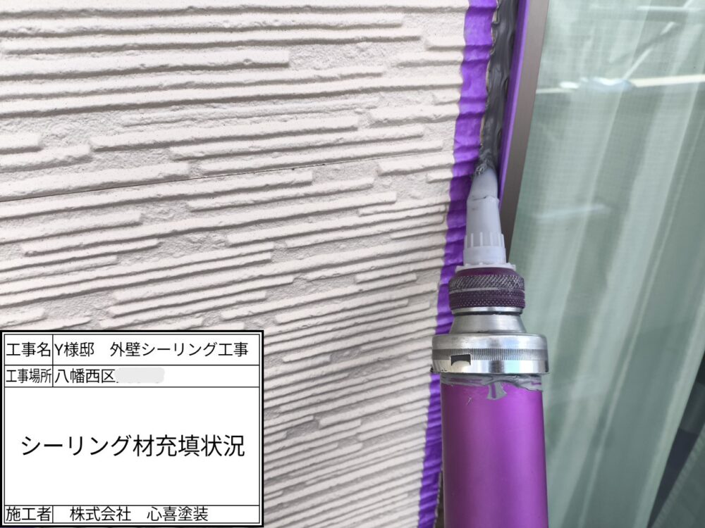 専用のコーキングガンで新しいコーキング材を充填します。目地内に間隙なく充填するためヘラで抑え込みます。新規シーリング材充填