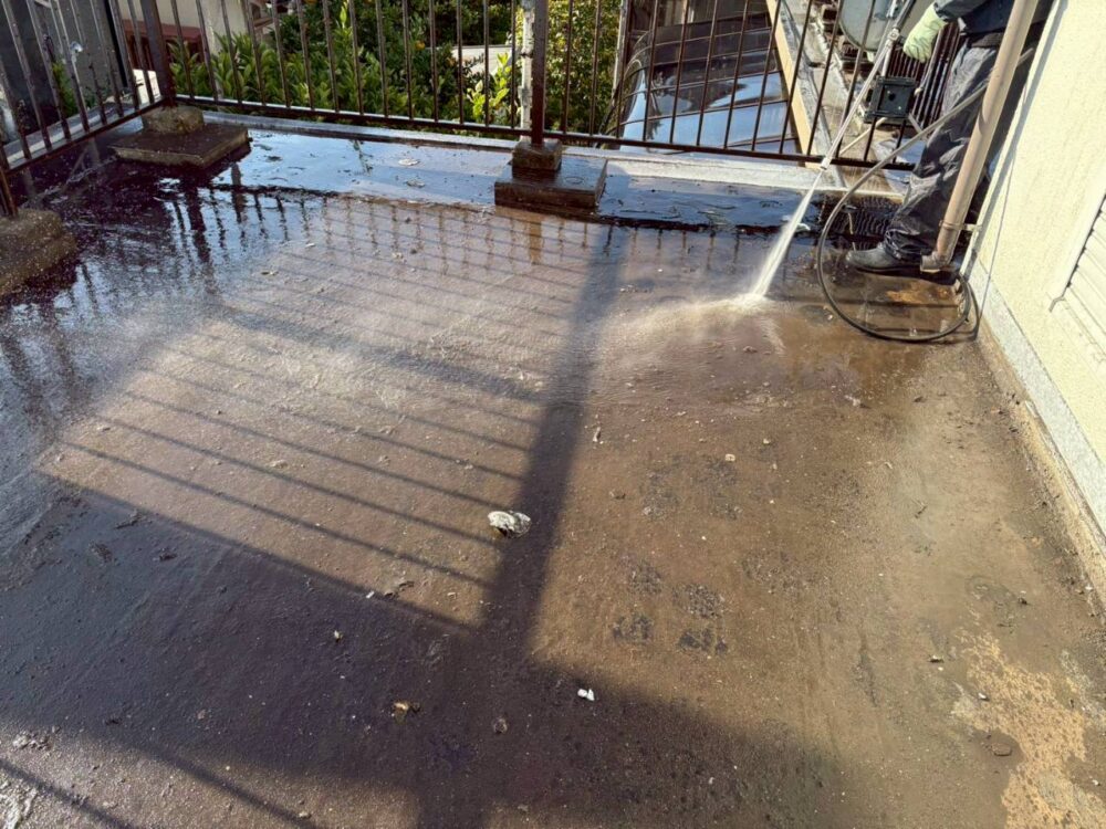 業務用の高圧洗浄機を使用して、汚れやごみを洗い流します。